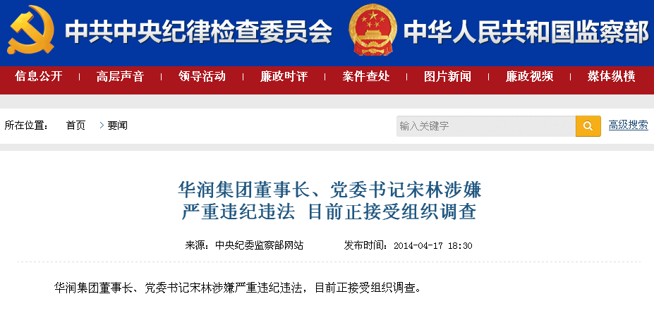 4月17日消息,據中央紀委監察部網站消息,華潤集團董事長、黨委書記宋林涉嫌嚴重違紀違法,目前正接受組織調查。